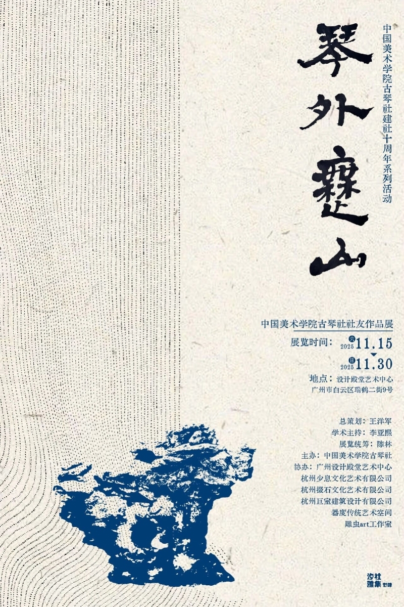 展览以“琴外无山”为题,希望借此精神象征,讨论当代青年艺术创作中“心境与物像”的多重关系。展览邀请了来自书法、国画、油画、版画、雕塑、摄影、漆艺、文物修复等不同专业的青年艺术家参与创作,试图建立一种宁静而连贯的观展节奏,让观者在作品之间获得一种由视觉转向内心的沉静体验。
