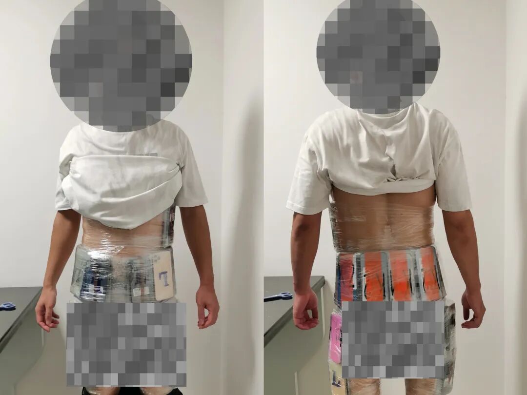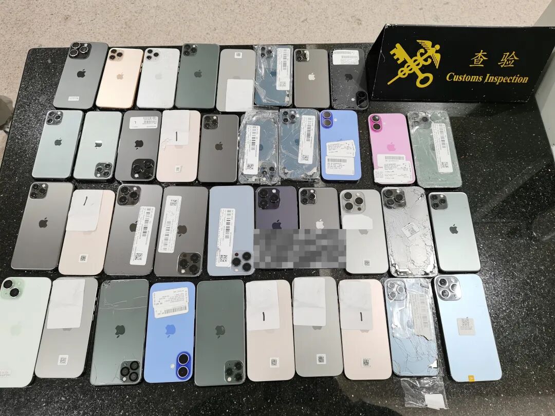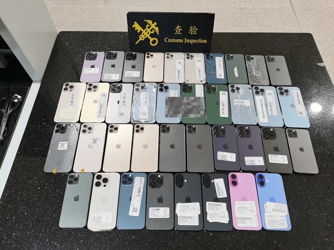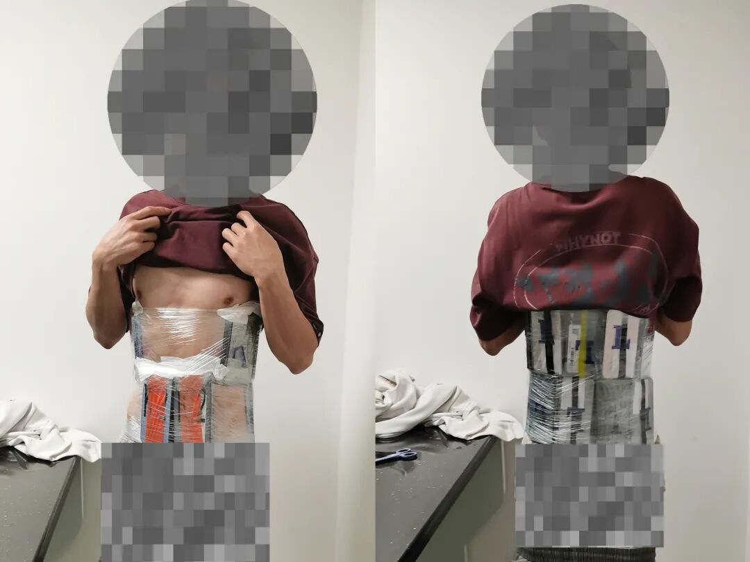 当日16时许,一名身着白色T恤的旅客,自青茂口岸旅检现场“绿色通道”进境,现场关员察觉其步态异常,遂拦截查验。经。进一步检查,关员在其腹部及大腿部查获用塑料膜捆绑的旧手机38台。